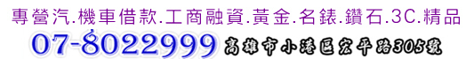 本公司專業當舖~為高雄市小港區當舖優質首選位於高雄市鳳山區鳳頂路397號 。 高雄市專業當舖專業提供汽車借款、機車借款、黃金、鑽石、名錶、3C產品、名牌精品..萬物皆可借款借錢服務。 專業當舖以創新動產融資公司,成為全方位合法當舖來服務每位顧客,本公司以扎實的雄厚資金、穩健經營的團隊,成功服務過上萬名客戶,秉持為大眾服務的精神為您提供更方便的融資管道,是公會認證的優質首選,合法經營,解決各行各業在資金週轉上的煩惱。 服務區域涵蓋大高雄地區、快速簡便、合法、專業、迅速、低利、保密是個人或企業、公司、工廠小額或大額借款融資的好夥伴。 相關網站:豐原大眾當舖.苗栗汽車借款.路竹當舖.大同區當舖